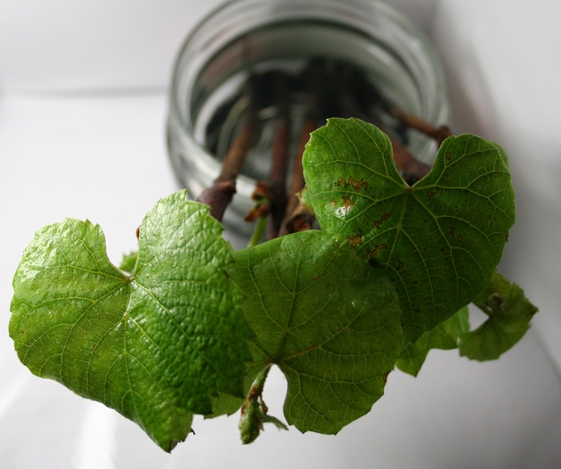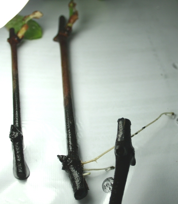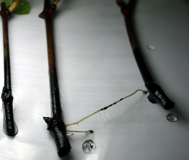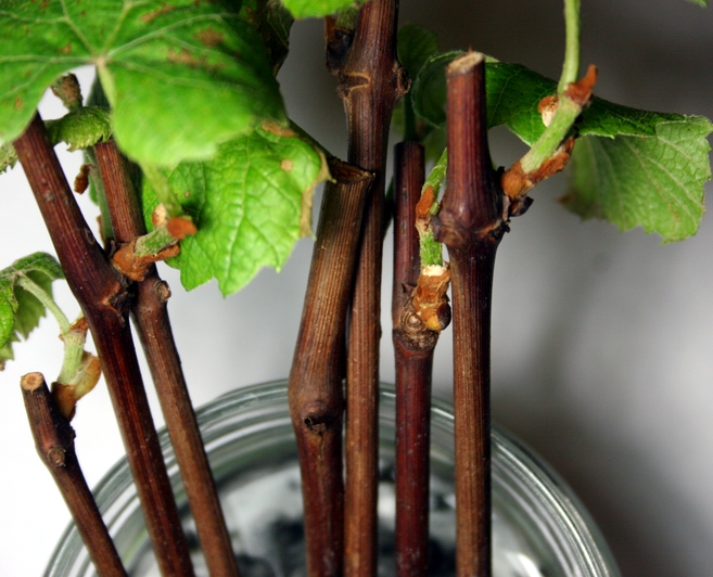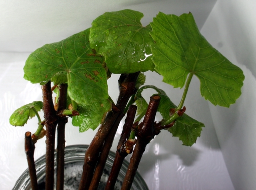 Пізніше додав ще води (приблизно 1:5, додав активованого вугілля одну таблетку, щоб вода не закисла. Поставив не підставку на підвіконні (вікно південної орієнтації), щоб холодне повітря від вікна не охолоджувало воду в банці. Через, приблизно, півтора тижня з бруньок зявились листки. Ще через півтора-два тижні зявились корінці. Спочатку вони зявились у чубука середньої товщини (при тому, що я не бороздував ні один чубук!!! І не парафінував бруньки!).