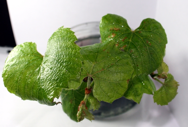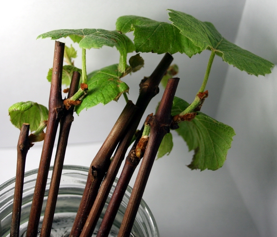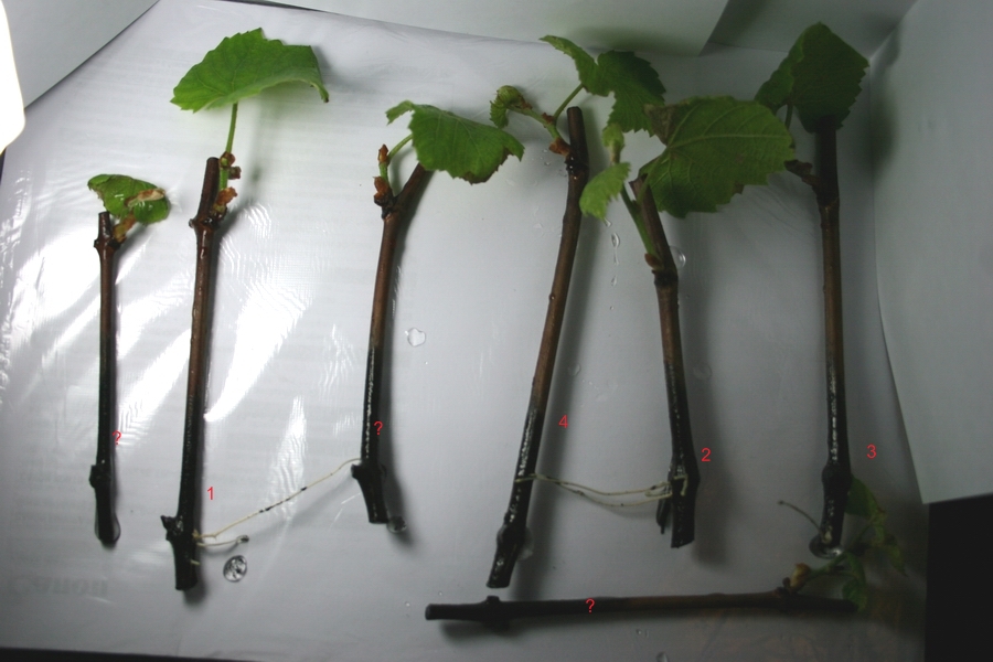 Чубуки я зрізав в кінці лютого з куща Ізабелли, який на зиму не вкривався, і гілки добре промерзли. Нарізав їх з одного пагона, так як хотів взнати залежність укорінення від того з якої часини взятий пагін, і від товщини пагона, при пророщуванні коріння в рівних для чубуків умовах.