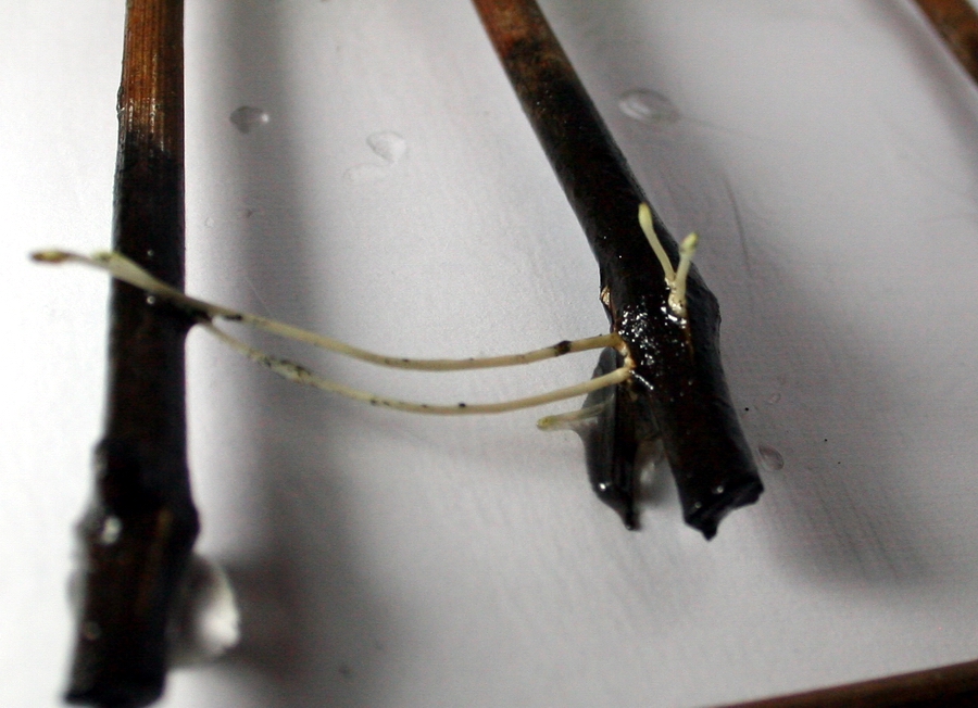 Також варта відмітити, що корінці зявляються не з нижньої бруньки, а на самому пагоні. Кора якого тріскає, і з-під неї зявляються білі зачатки коренів, а потім і самі корінц, які досить інтенствно ростуть. Тому не варта тримати чубуки й надалі в банці з водою, коли корінці виросли більш як на 4-5 см. Їх треба одразу пересадити в пухку, повітропроникну грунтосуміш. Я збираюсь використовувати грунтосуміш універсальну, яка є досить популярна і доступна у господарських магазинах. Але про це – у наступній статті.