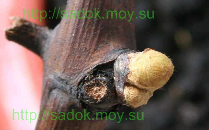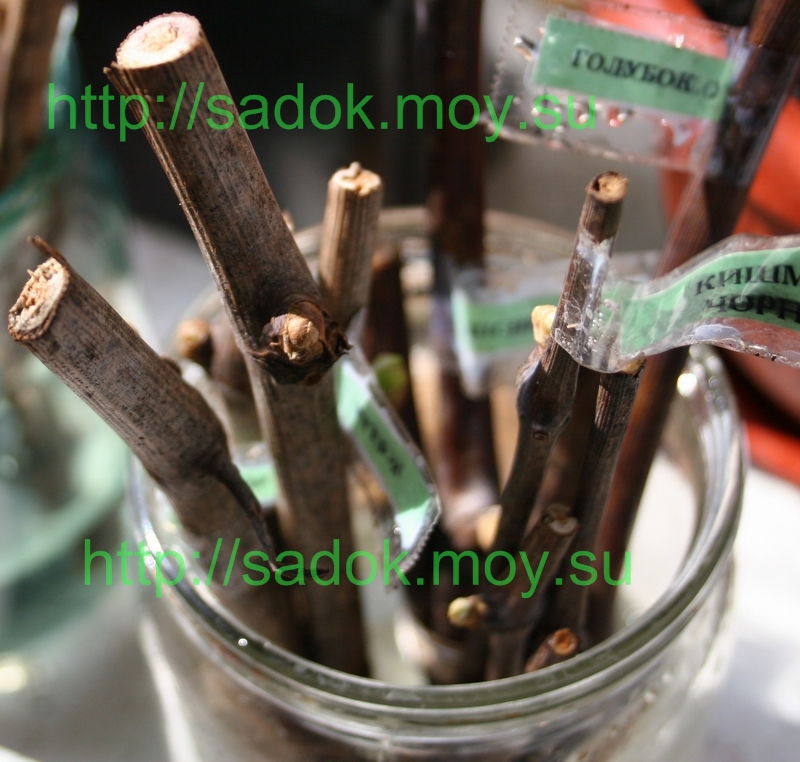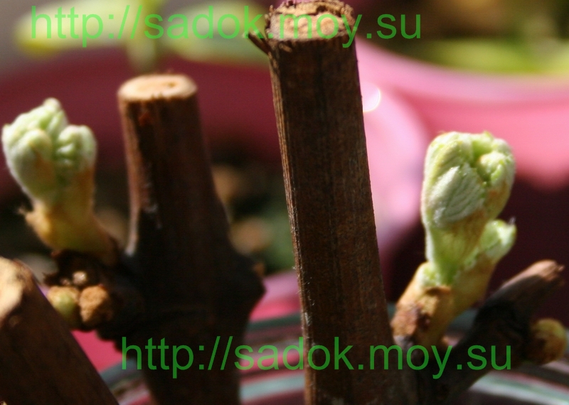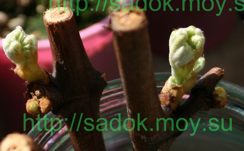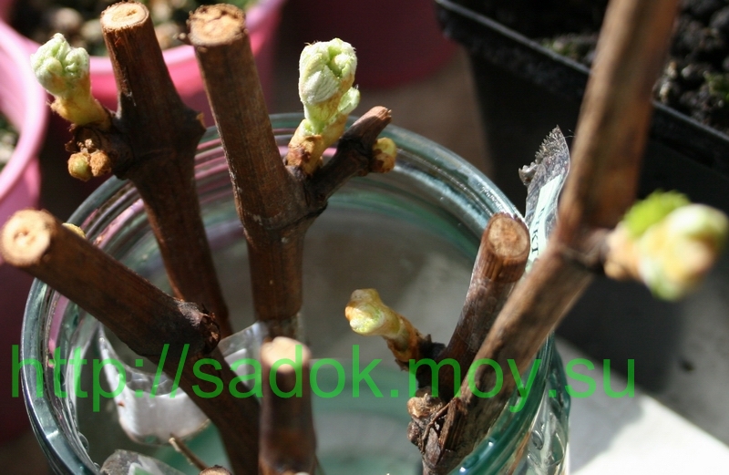 На сьогоднішній день уже помітно почали розпусктись бруньки чубуків. В кімнаті середня температура в межах 25 градусів (на підвіконні). Бруньки ожили але не на всіх чубуках одразу, але при оинакових умовах (можливо лише освітлення не було рівномірне на всі чубуки, бо стояли в одній півлітровій банці). У сортів: Кишмиш запорізький, Егер-2, Пісня, Голубок ледь помітно набубнявіли бруньки.