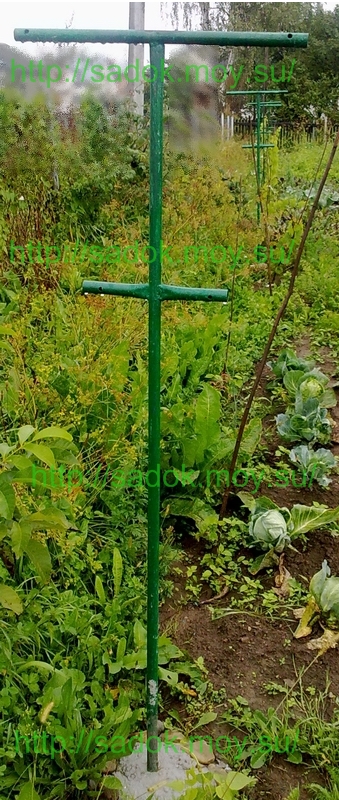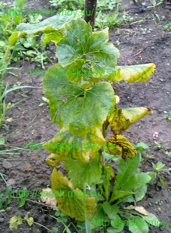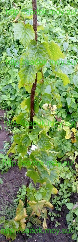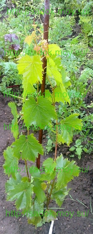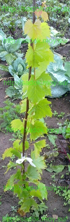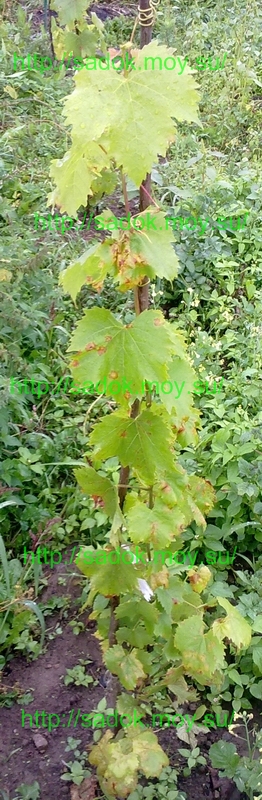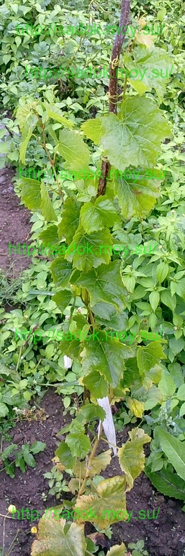 Ліва крайня опора для закріплення тросу з розтяжками Опора Т-подібної шпалери Найгрше розвинувся кущ винограду (фото внизу) так як обмерзли всі бруньки крім одної, яка знаходилась під землею. коли пагони всіх решта кущів мали довжину 50-60 см, то цей тільки виходив з поверхні землі. Кущі були оброблені лише препаратом "Гумі+" цього року більше нічим не обробляв. Зважаюч на те що цього року було дощове літо і не багато сонясних днів,- виноград пошкоджений не значно, можна сказати, що встояв проти грибкових захворювань. На даний момент до шпалери виноград не підвязував, так як не впевнений що лоза достатньо визріє. хочу прийняти міри по утепленні пагонів, щоб вдало перезимували.