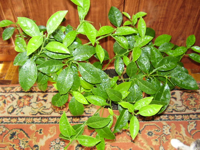В розділі фотоальбоми під назвою "Схоже апельсин" розміщене фото цієї рослини. Вирощуючи її я не мав уявлення по-перше що це за рослина, по-друге як її вирощувати. Протягом перших трьох років я експериментував над деревцем. При вирощуванні в погано освітленій кімнаті деревце скинуло майже все листя і не зявлялись нові гілочки. Тоді я прищипнув коротко, майже всі гілочки і поставив на балкон (початок літа). Через тиждень вже зявились бруньки. Бруньки подовження я позрізав, а бруньки для розгалуження гілочок залишив. Через місяць-півтора деревце було вкрите листям. Потім, взимку я забрав деревце до кімнати, в якій замітно сповільнився ріст і розвиток. Протягом 3 років я фактично не підживлював рослину. Всі корисні речовини, які були в грунті, були доступні для деревця. Обприскував раз в 2-3 місяці. Потім, прочитавши книгу ( в списку літератури під номером 1), доглядання дещо змінилось,- я пересадив деревце так, як вказано в книзі, в горщик з дренажем, почав активно підживлювати добривами, які були доступні для мене. Це переважно або порошкоподібні універсальні добрива для цитрусових або ж палички польського виробництва, які містили поживні мінеральні речовини. Почав розріджувати крону, для того щоб надати максимальний доступ всім листочкам до сонячного світла. Попробував ромножувати живцюванням, і с першої спроби живець прижився, зараз він виглядає так: